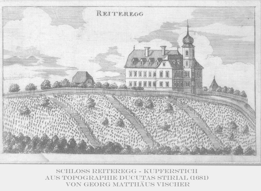 Schloss Reiteregg wurde im 17. Jahrhundert auf der Kuppe des Hügelzuges, der das Liebochtal vom Södingtal trennt, errichtet. Der damals aus zwei aneinandergebauten Gebäuden bestehende Bau ging auf ein seit der zweiten Hälfte des 16. Jahrhunderts nachweisbares Bauerngut zurück. Als im Jahr 1660 Ferdinand Ignaz Freiherr von Moscon Reiteregg kaufte, hatte sich das Anwesen bereits zu einem herrschaftlichen Edelsitz entwickelt. Der genannte Ferdinand Ignaz von Moscon entfaltete eine rege Bautätigkeit und erweiterte und erneuerte das Schloss, wie auf einer noch erhaltenen Inschrift zu lesen ist: „Von Grund auf habe ich das Haus errichtet, nicht für mich, sondern die Nachkommenschaft, unter Mithilfe der Jungfrau, der Lob gebührt, und das Gott unversehrt mit allen Nachkommen bewahren möge“.