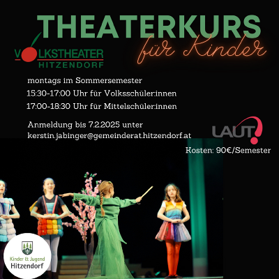 In diesem Kurs werden die Kinder in die faszinierende Welt des Theaters eingeführt und können ihre kreative Seite ausleben. Unter der professionellen Anleitung einer erfahrenen Theaterpädagogin werden sie spielerisch in die Grundlagen des Schauspielens eingeführt und lernen dabei auch, ihre Stimme und Körpersprache gezielt einzusetzen.