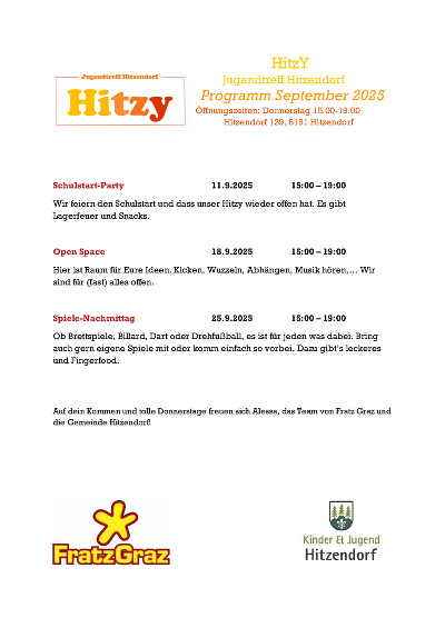Der Jugendtreff "Hitzy" findet jeden Donnerstag von 15.00 bis 19.00 Uhr im Jugendraum Hitzendorf statt.