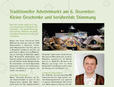 Alle Jahre wieder steigt am 2. Advent-Samstag der Hitzendorfer Adventmarkt - mit Standl-Stimmung, Feuerschalen, Glühwein und einem lebendigen Programm im neuen Gemeindesaal.