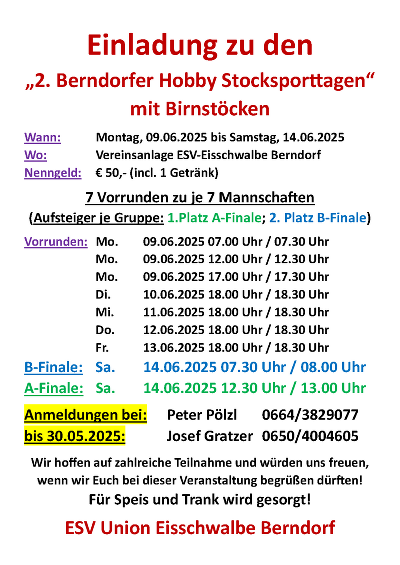 Anmeldungen bis 30.05.2025: bei Peter Pölzl unter +43 (664) 3829077 oder Josef Gratzer unter +43 (650) 4004605
