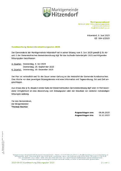 Kundmachung Gemeinderatssitzungsplan 2025 angeschlagen von 06.06.2025 bis 31.12.2025 PDF downloaden/drucken » Link: https://hitzendorf.gv.at/cms/beitrag/10079465/906288/