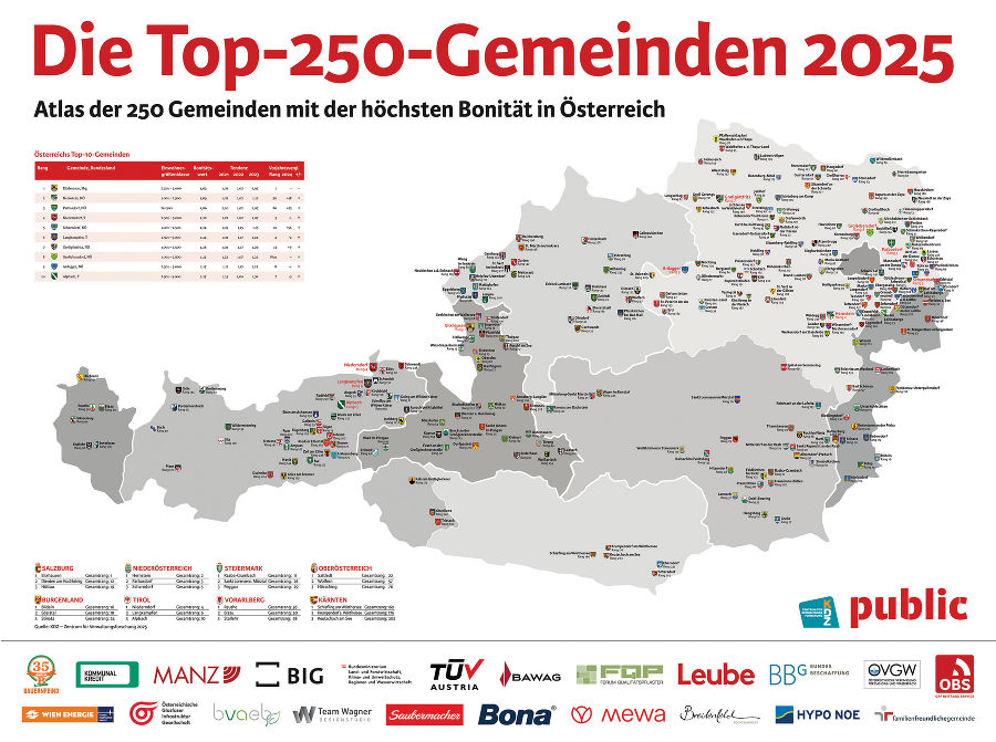 Das Wort „Bonität“ hören wir immer wieder, beschreibt es doch, ob eine Person, ein Unternehmen oder auch eine Gemeinde kreditwürdig ist. In konkreten Fall hat das KDZ (Zentrum für Verwaltungsforschung) untersucht, in welchem Ausmaß die wirtschaftliche Zuverlässigkeit und damit verbunden die Kreditwürdigkeit aller 2.093 österreichischen Gemeinden gegeben ist und so ein Ranking der wirtschaftlich zuverlässigsten Gemeinden erstellt.