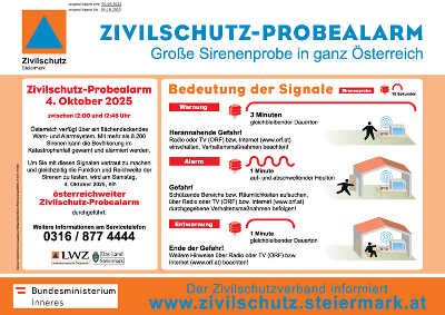 Am Samstag, den 4. Oktober 2025, wird wieder ein bundesweiter Zivilschutz-Probealarm durchgeführt. Zwischen 12:00 und 12:45 Uhr werden nach dem Signal „Sirenenprobe“ die drei Zivilschutzsignale „Warnung“, „Alarm“ und „Entwarnung“ in ganz Österreich ausgestrahlt werden. Der Probealarm dient einerseits zur Überprüfung der technischen Einrichtungen des Warn- und Alarmsystems, andererseits soll die Bevölkerung mit diesen Signalen und ihrer Bedeutung vertraut gemacht werden.