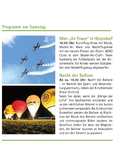 Um 18 Uhr am Vorabend des Marktfestes zaubern die besten Piloten des Österreichischen AERO-Clubs und das Model-Air-Craft-Team Spielberg eine Kunstflugshow mit Musik in den Hitzendorfer Himmel. Für Kinder werden Süßigkeiten vom Modellflugzeug abgeworfen.
