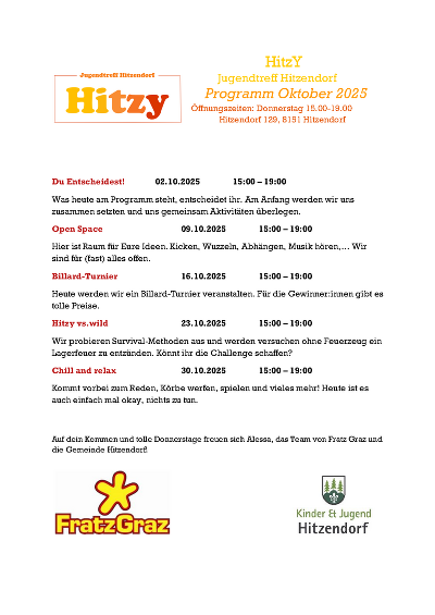 Der Jugendtreff "Hitzy" findet jeden Donnerstag von 15.00 bis 19.00 Uhr im Jugendraum Hitzendorf statt.