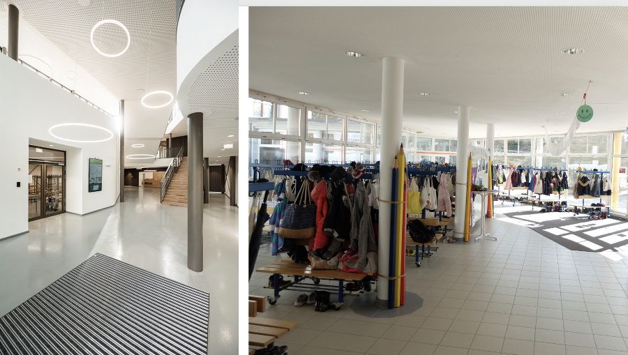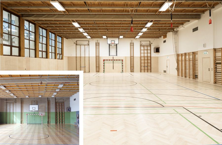 > Die allermeisten Klassen sind digitalisiert, Whiteboard & Beamer statt grüner Schultafel. > Ein Multifunktions-Marktplatz, der Medienraum, das Schulmanagement sowie Garderoben wurden im neuen Verbindungstrakt untergebracht.