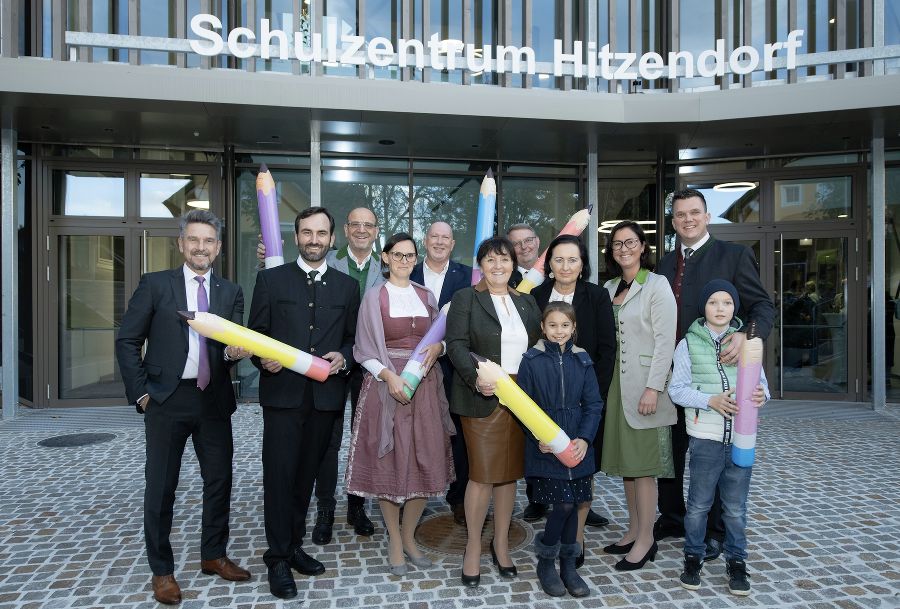 Nach 16 Monaten Bauzeit, zum allergrößten Teil während des regulären Schulbetriebes, präsentiert sich das Schulzentrum Hitzendorf in neuem Glanz - mit transparenten Unterrichtsräumen für Volks-, Mittel- und Polytechnische Schule, einem gesicherten Eingangsbereich, digitalem Leitsystem und einem „fliegenden Klassenzimmer" auf der Dachterrasse. Zum Start der Herbstferien wurde das Gebäude für mehr als 550 Kinder und Jugendliche offiziell eröffnet.