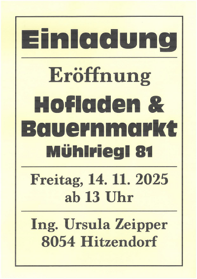 Eröffnung Hofladen und BauernmarktIng. Ursula ZeipperFr, 14.11.202513:00Ort:Mühlriegl 81 Aussendung des Veranstalters: PDF downloaden/drucken » Veranstaltungsort anzeigen » Link: https://hitzendorf.gv.at/cms/beitrag/10080762/10731/