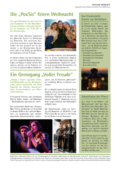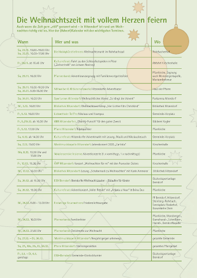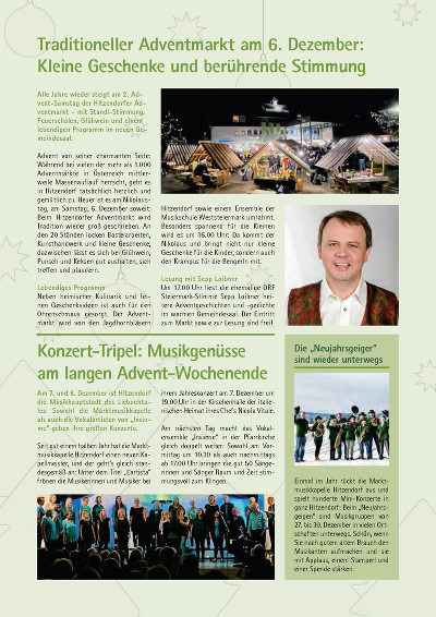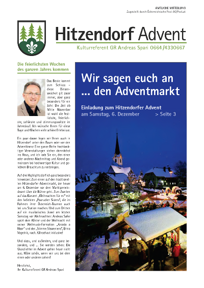 Anschlag Hitzendorf Aktuell, Sonderausgabe "Advent"Amtliche Mitteilungen aus der Marktgemeinde angeschlagen ab 19.11.2025 PDF downloaden/drucken » Weitere Ausgaben von Hitzendorf Aktuell finden Sie hier » Link: https://hitzendorf.gv.at/cms/beitrag/10080843/906288/