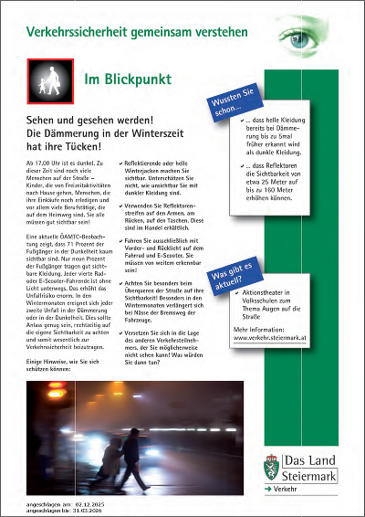 Anschlag Verkehrssicherheit gemeinsam verstehen angeschlagen von 02.12.2025 bis 31.03.2026 PDF downloaden/drucken » Link: https://hitzendorf.gv.at/cms/beitrag/10080876/906288/