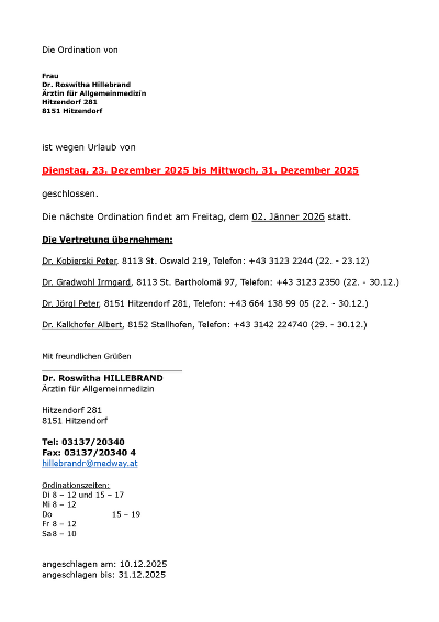 Anschlag Urlaubsmeldung Dr. Roswitha Hillebrand angeschlagen von 10.12.2025 bis 31.12.2025 PDF downloaden/drucken » Link: https://hitzendorf.gv.at/cms/beitrag/10080907/906288/