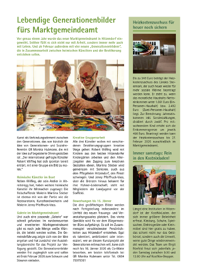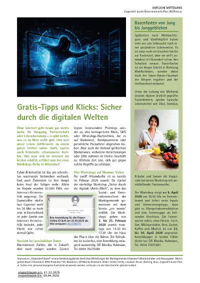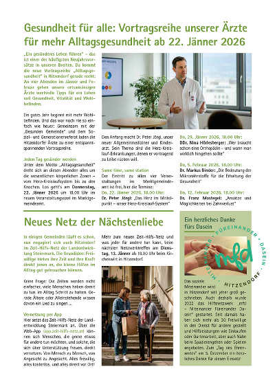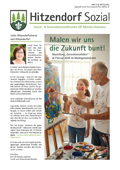Anschlag Hitzendorf Aktuell, Sonderausgabe "Sozial"Amtliche Mitteilungen aus der Marktgemeinde angeschlagen von 17.12.2025 bis 09.04.2026 PDF downloaden/drucken » Weitere Ausgaben von Hitzendorf Aktuell finden Sie hier » Link: https://hitzendorf.gv.at/cms/beitrag/10080937/21714/