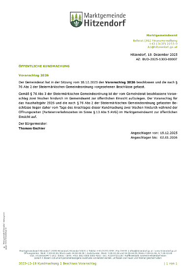 Kundmachung Voranschlag 2026 angeschlagen von 19.12.2025 bis 02.01.2026 PDF downloaden/drucken » Link: https://hitzendorf.gv.at/cms/beitrag/10080951/21714/