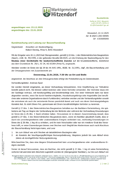 Kundmachung und Ladung zur BauverhandlungRobert Stering angeschlagen von 23.12.2025 bis 22.01.2026 PDF downloaden/drucken » Link: https://hitzendorf.gv.at/cms/beitrag/10080952/21729/
