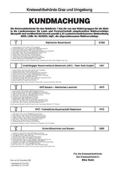 Kundmachung Landwirtschaftskammerwahlen 2026 - Wahlvorschläge Kreiswahlbehörde angeschlagen von 29.12.2025 bis 25.01.2026 PDF downloaden/drucken » Link: https://hitzendorf.gv.at/cms/beitrag/10080956/87432/
