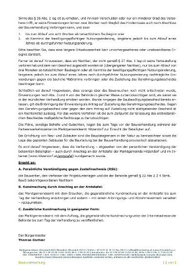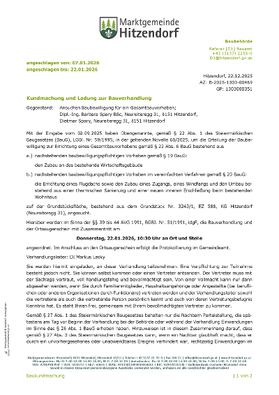 Kundmachung und Ladung zur BauverhandlungDipl. Ing. Barbara Spary BSc und Dietmar Spary angeschlagen von 07.01.2026 bis 22.01.2026 PDF downloaden/drucken » Link: https://hitzendorf.gv.at/cms/beitrag/10080958/21729/