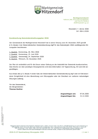 Kundmachung Gemeinderatssitzungsplan 2026 angeschlagen von 07.01.2026 bis 31.12.2026 PDF downloaden/drucken » Link: https://hitzendorf.gv.at/cms/beitrag/10081017/21714/