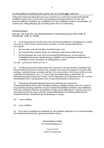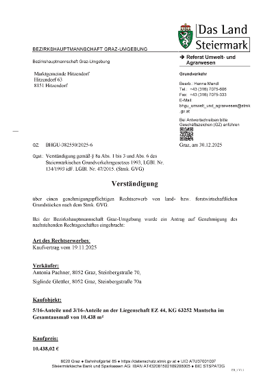 Kundmachung genehmigungspflichtiger Rechtserwerb von land- bzw. forstwirtschaftlichen Grundstücken