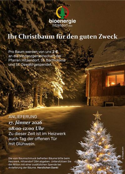 Die vom Baumschmuck befreiten Bäume bitte beim Heizwerk, Hitzendorf 284 abgeben. Bei der Anlieferung besteht die Möglichkeit, die Aktion mit einer zusätzlichen Spende zu unterstützen.