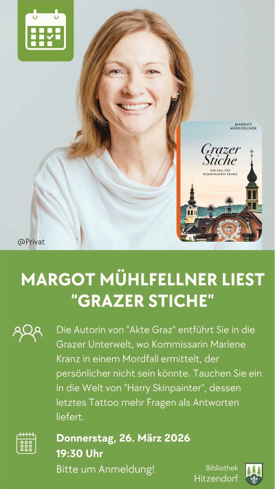 Lesung mit Margot Mühlfellner "Grazer Stiche"Öffentliche Bibliothek HitzendorfDo, 26.03.202619:30 Anmeldung erbetenNähere Infos zum Veranstalter » Aussendung des Veranstalters: PDF downloaden/drucken » Link: https://hitzendorf.gv.at/cms/beitrag/10081280/13570/
