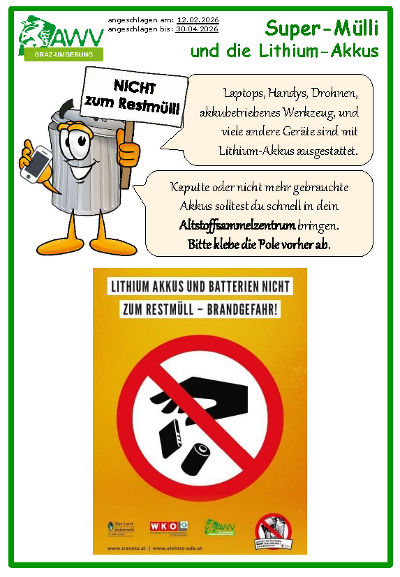 Anschlag Super-Mülli und die Lithium-Akkus angeschlagen von 12.02.2026 bis 30.04.2026 PDF downloaden/drucken » Link: https://hitzendorf.gv.at/cms/beitrag/10081281/906288/
