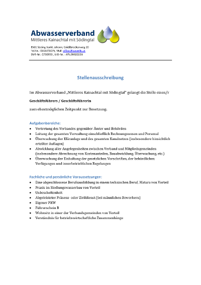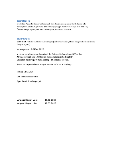 Anschlag Geschäftsführer:in für Abwasserverband Mittleres Kainachtal mit Södingtal gesucht angeschlagen von 18.02.2026 bis 12.03.2026 PDF downloaden/drucken » Link: https://hitzendorf.gv.at/cms/beitrag/10081336/21714/