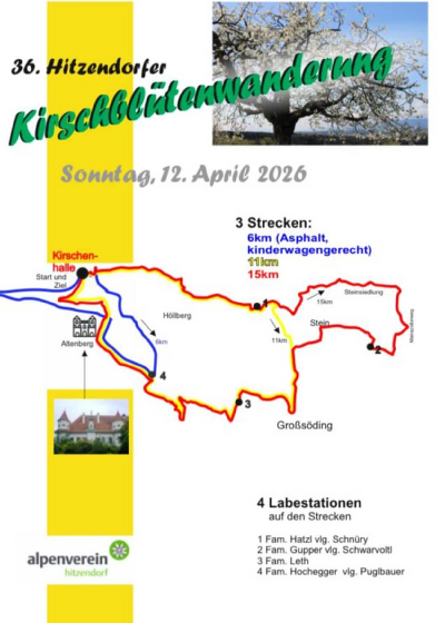 Los geht es zwischen 8:00 und 11:00 Uhr bei der Kirschenhalle in Hitzendorf. Anschließend führen drei abwechslungsreiche Wanderstrecken durch das wunderschöne Hitzendorfer Gemeindegebiet. Neben einer kinderwagengerechten Route mit 6 Kilometern stehen auch Strecken mit 11 und 15 Kilometern Länge zur Auswahl, sodass für jede Kondition eine passende Variante dabei ist.