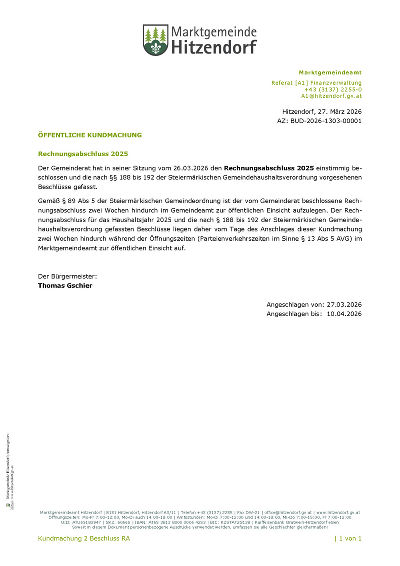 Kundmachung Genehmigung Rechnungsabschluss 2025 angeschlagen von 27.03.2026 bis 10.04.2026 PDF downloaden/drucken » Link: https://hitzendorf.gv.at/cms/beitrag/10082051/21714/