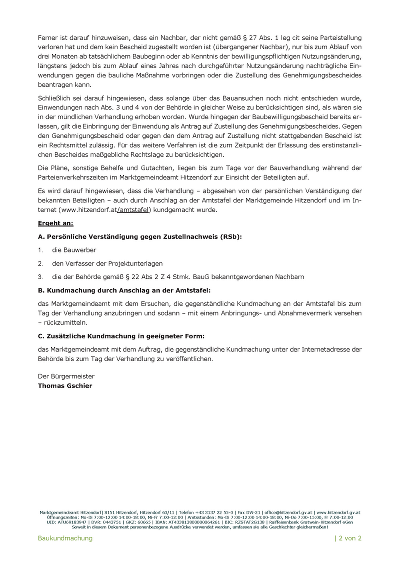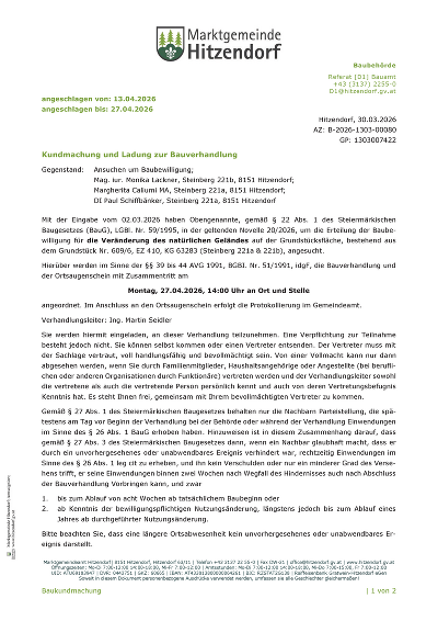 Kundmachung und Ladung zur BauverhandlungMag. iur. Monika Lackner, Margherita Caliumi MA, DI Paul Schiffbänker angeschlagen von 13.04.2026 bis 27.04.2026 PDF downloaden/drucken » Link: https://hitzendorf.gv.at/cms/beitrag/10082058/906311/