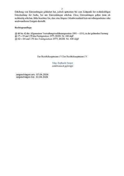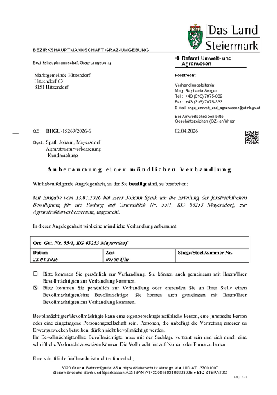 Kundmachung forstrechtliche Bewilligung für RodungJohann Spath angeschlagen von 07.04.2026 bis 22.04.2026 PDF downloaden/drucken » Link: https://hitzendorf.gv.at/cms/beitrag/10082073/906288/