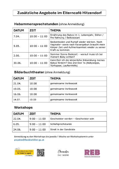 Hinweis: Das gesamte Angebot findet kostenlos und ohne Anmeldung jeden Dienstag (siehe ArGe flexible Hilfen ») statt.