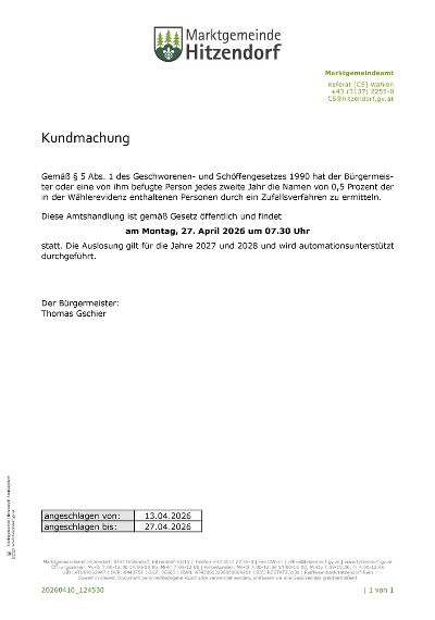 Kundmachung Auslosung Geschworene und Schöffen für 2027/2028 angeschlagen von 13.04.2026 bis 27.04.2026 PDF downloaden/drucken » Link: https://hitzendorf.gv.at/cms/beitrag/10082119/906288/